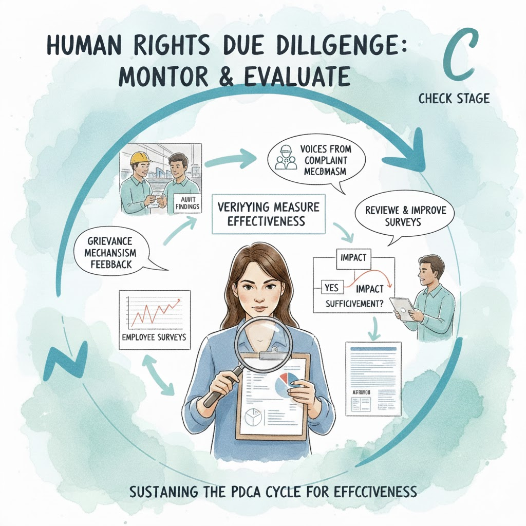 これは、PDCAサイクルで言えば C(Check)にあたります。防止・軽減措置が、実際に人権リスクの低減に繋がっているかを継続的に追跡・評価(モニタリング)します。