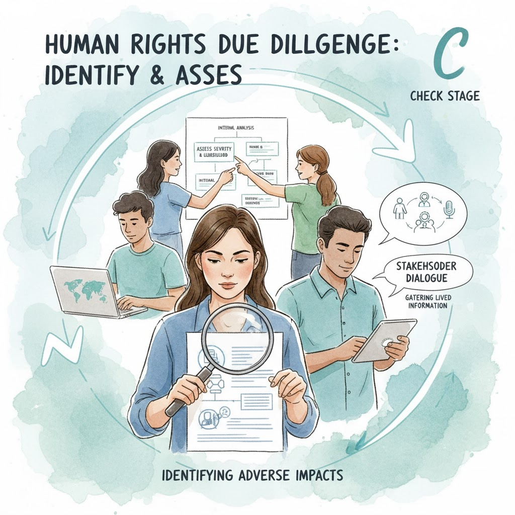 人権方針の策定に続いて、人権デュー・ディリジェンス(Human Rights Due Diligence ; HRDD ; 人権DD )を行います。