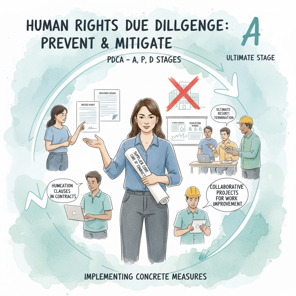 評価の結果、効果が不十分なら、対策の見直しや改善を行います。このPDCAサイクルを回し続けることが、人権デュー・ディリジェンスの実効性を担保する上で不可欠です。